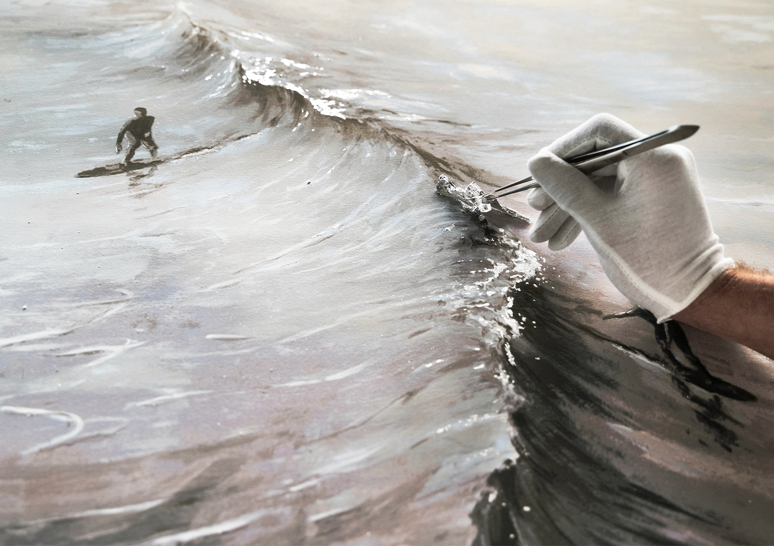 TECHNIQUE: Serigraph print combining seventeen hand-pulled silk screens on white, fine-grained Arches Velin BFK Rives paper (100% cotton, 300 gsm). Hand-finished by the artist in genuine 999/1000 silver leaf and acrylic paint. Details vary between each copy.